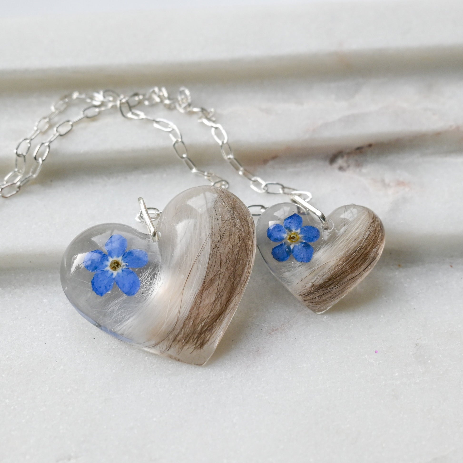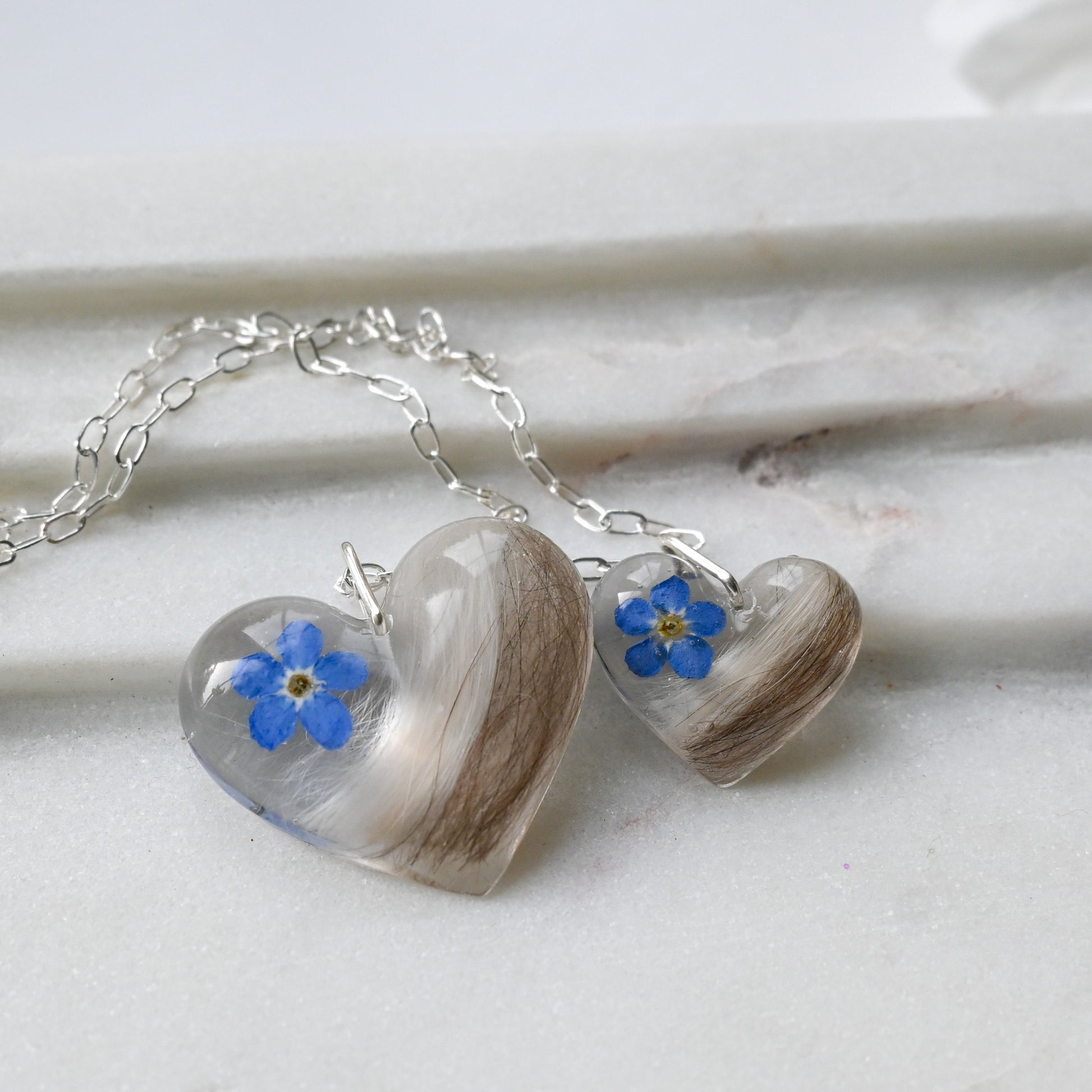 Pet Fur Necklace Set: Small & Big Heart Pendants (18mm and 24mm) | Memory necklace with forget-me-not flower | Fur keepsake set with resin